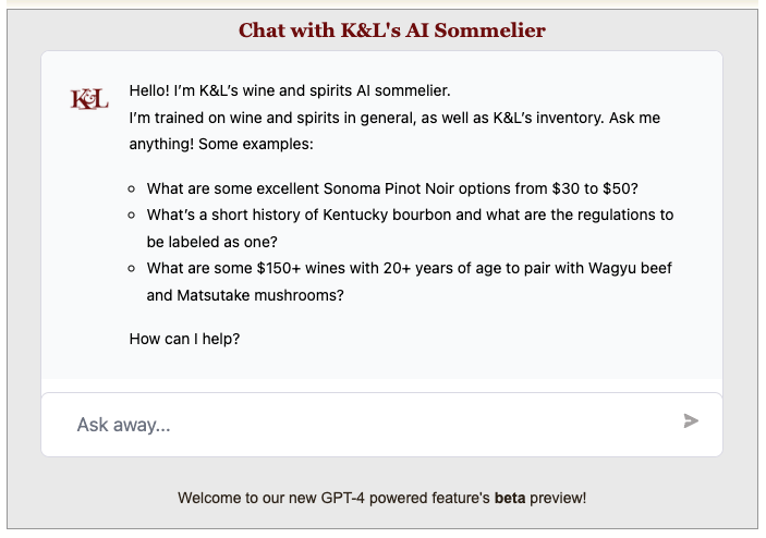 Here’s a small but indictive recent example. K&L is a pretty well respected wine merchant in California. They have a wide selection, friendly and knowledgeable staff, and a website that looks like it hasn’t been updated since the early 2000s with long form human reviews of recent shipments. (I like this). Last time I vistied their website I noticed they had shipped an “AI Sommelier” product to their home page. It’s an interesting concept, and I can imagine a version of this product that might be nicely implemented. Unfortunately this is not that.From a product marketing point of view I find the reference to “GPT-4” and “beta” to be irrelevant (and off-putting)